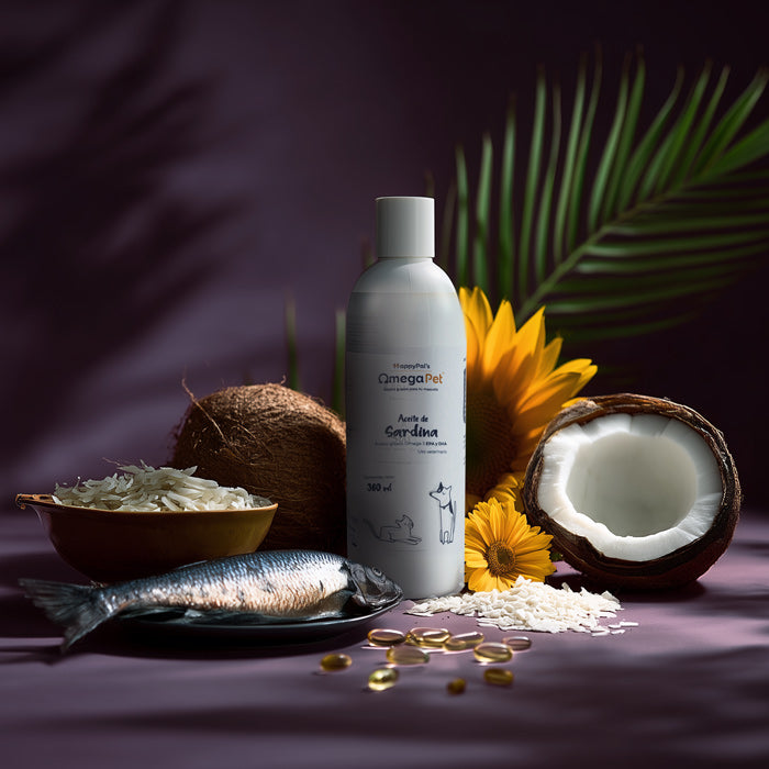 Omegapet combina tres aceites naturales —sardina, girasol y coco— que aportan ácidos grasos esenciales, antioxidantes y energía pura para fortalecer su cuerpo día tras día.