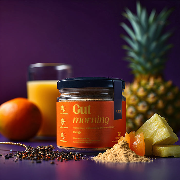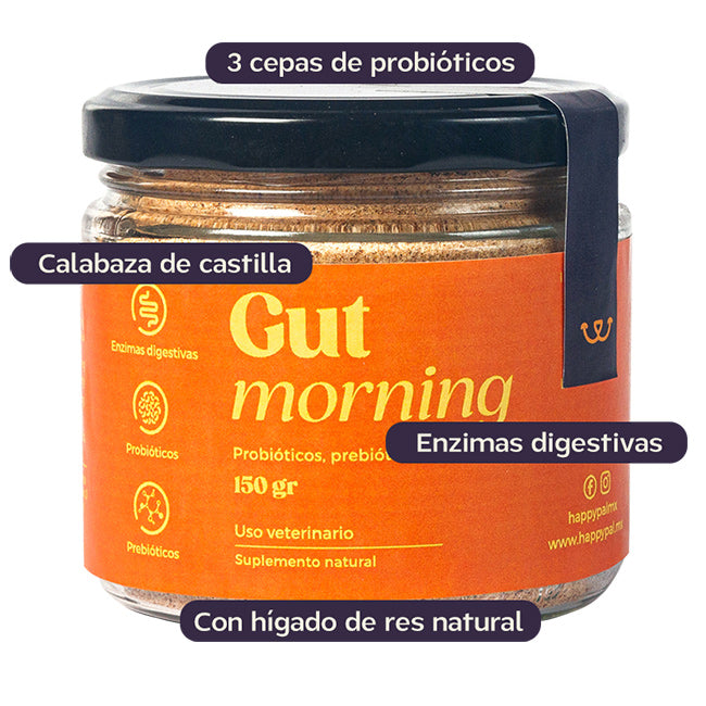 Si tu perro evacúa heces blandas o malestar digestivo, el consumo diario de gut morning puede ayudar a reducir gases, inflamación y favorecer una consistencia normal en las heces y los movimientos intestinales, además de mejorar su aliento.