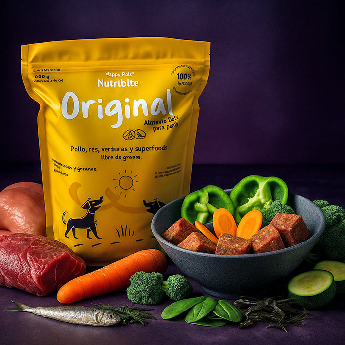 Nutribite es nuestra dieta BARF premium, elaborada con ingredientes de grado humano, carnes frescas, vegetales, superalimentos y suplementos funcionales. Sin harinas, conservadores ni ultraprocesados. Nutrición real, balanceada y diseñada por veterinarios para mejorar energía, digestión, piel, pelaje y bienestar diario.