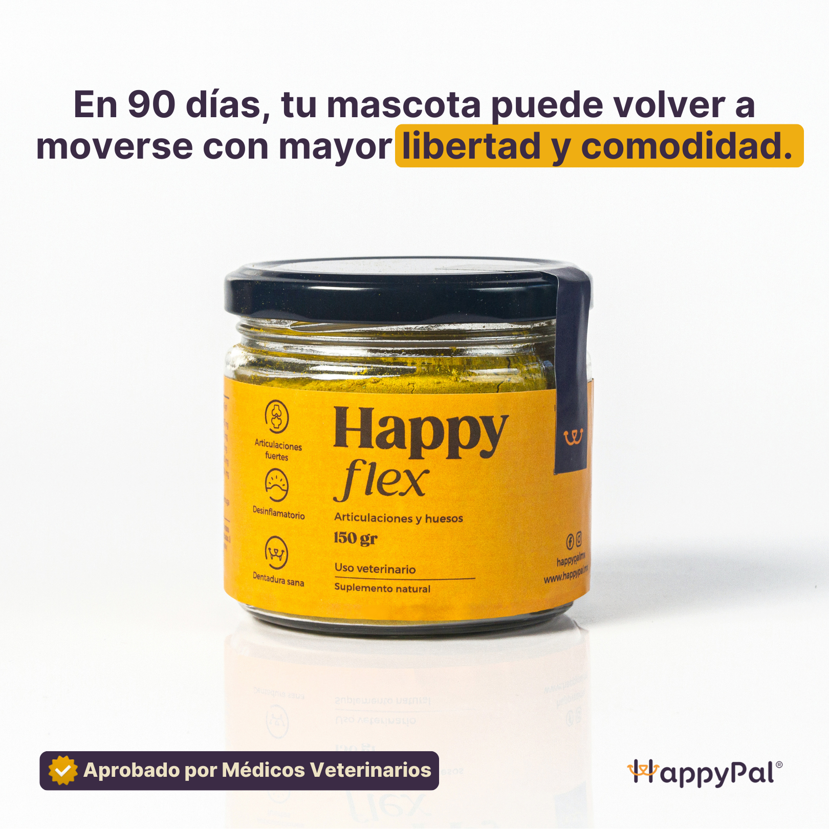 Durante años ha corrido a tu lado. Hoy le cuesta levantarse. Happy Flex ayuda a reducir inflamación, aliviar dolor y mejorar la movilidad en los a partir de los primeros 30 días.