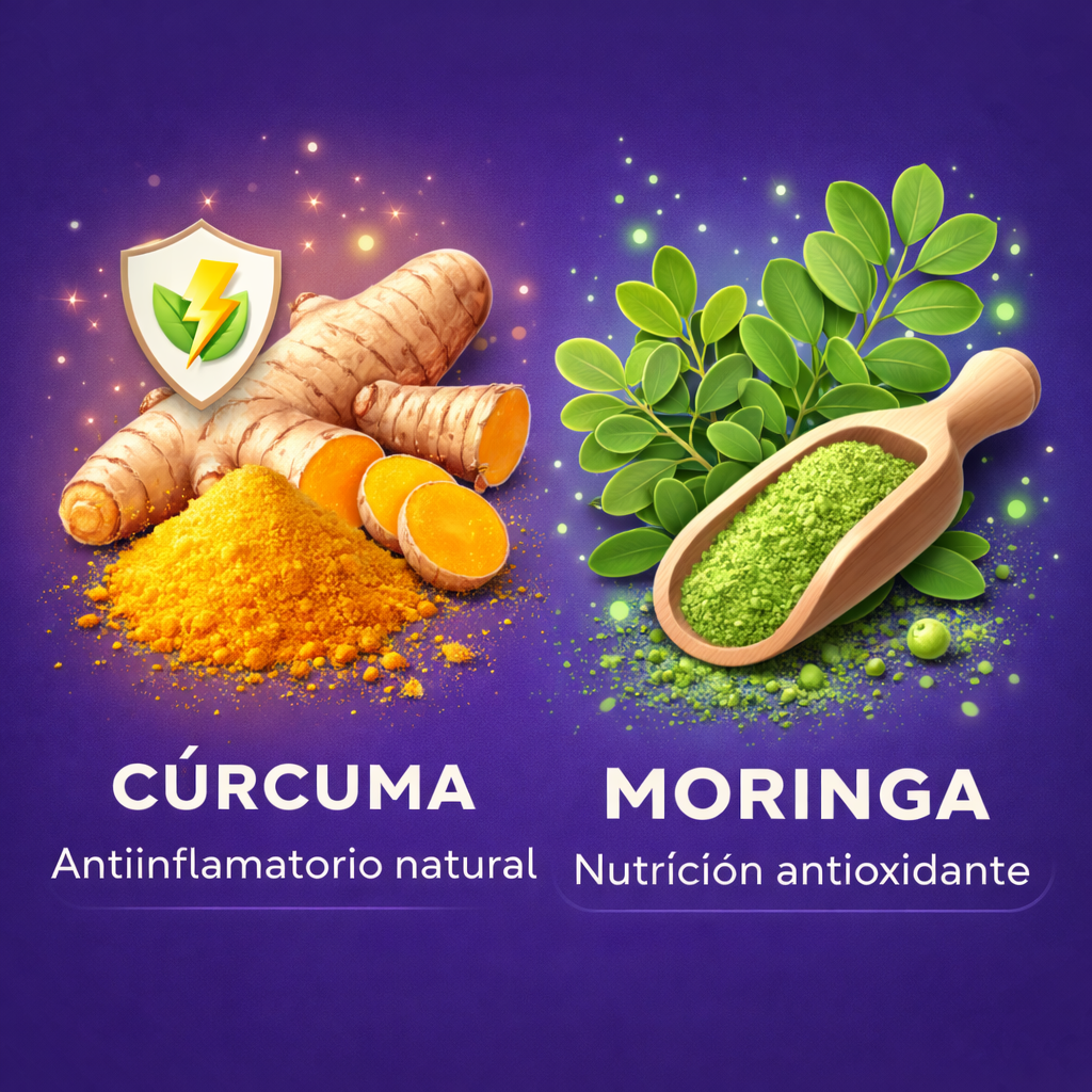 - Moringa: rica en vitaminas, minerales y aminoácidos esenciales; aporta energía, mejora la digestión y fortalece el sistema inmunológico.